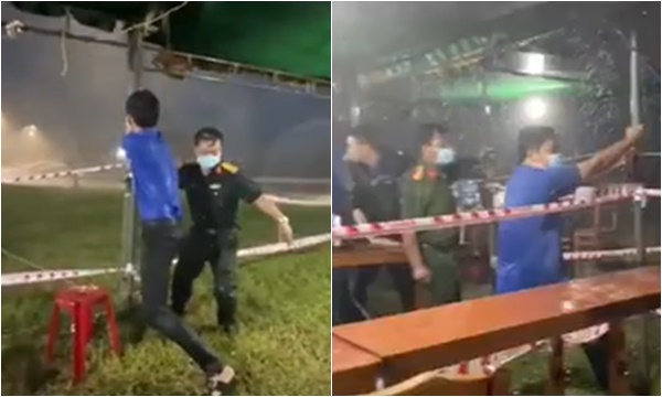Cụ thể, trong video ghi lại cảnh nhiều cán bộ, chiến sĩ đang gồng mình chống chọi với cơn giông lớn. Các cán bộ, chiến sĩ trong chốt kiểm dịch người nào người nấy đã ướt hết, nhưng vẫn đồng lòng để giữ bằng được chiếc lán dã chiến này.
