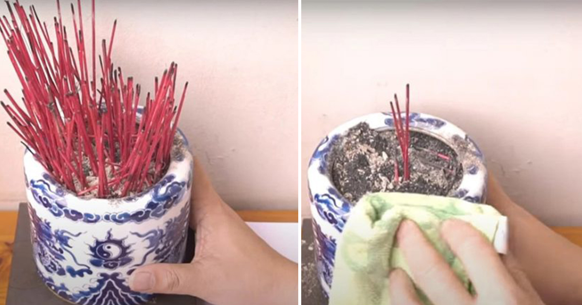 – Lau sạch bát hương trước, sau đó mới đến đồ thờ. Chân nhang đã tỉa xong mang hóa thành tro rồi đổ vào gốc cây hoặc ao hồ nước sạch. Không bỏ tro vào thùng rác hoặc nơi ô uế, bẩn thỉu.