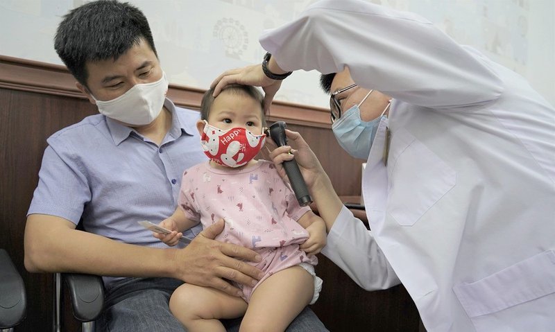 Nhân viên y tế cẩn thận khám sức khoẻ cho em nhỏ trước khi tiêm. (Ảnh: Lao Động)