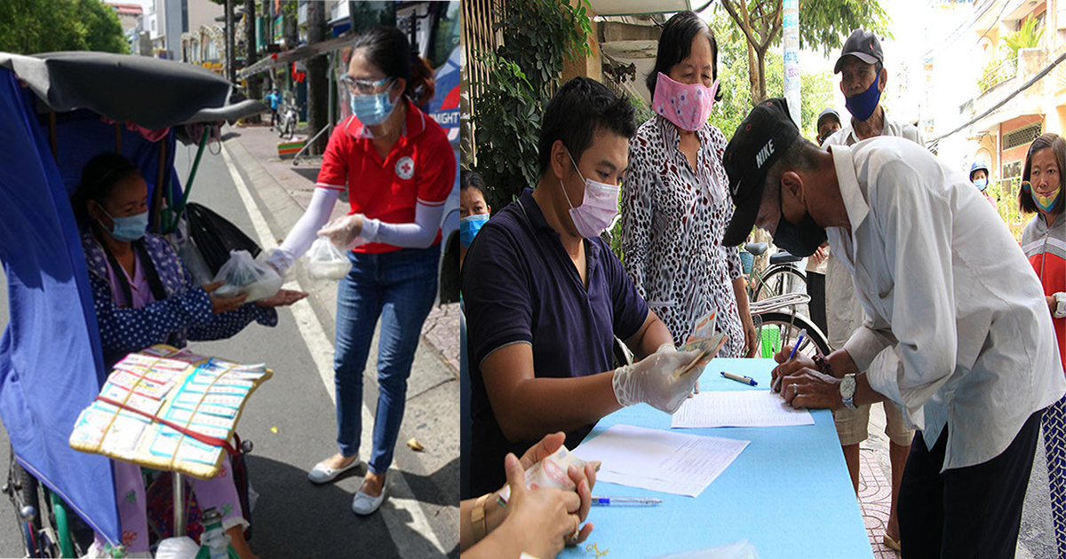 Người tàn tật đi bán vé số cần sự hỗ trợ của chính quyền và xã hội trong mùa dịch COVID-19. Trong ảnh: tình nguyện viên Hội Chữ thập đỏ P.5 (Q.Tân Bình, TP.HCM) tặng cơm chay cho người nghèo, người tàn tật đi bán vé số (ảnh chụp trên đường Hoàng Sa) – Ảnh: NGUYỄN CÔNG THÀNH