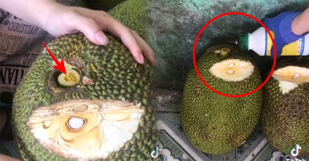 Cụ thể, tài khoản TikTok N.M.A đăng tải đoạn clip so sánh hai quả mít: một quả vô thuốc, quả còn lại thì không. Trước khi tiến hành thử nghiệm, tiểu thương này cho biết kinh nghiệm của bản thân không có nhiều, tuy nhiên, đủ để cung cấp những thông tin cơ bản cho người tiêu dùng. Hai quả mít được nữ TikToker lựa chọn có độ xanh ngang nhau. Quả vô thuốc sẽ được khoét một lỗ sâu ở cuống, sau đó trực tiếp nhỏ dung dịch (người này cho biết đây là chai thuốc được Bộ Nông nghiệp sử dụng).