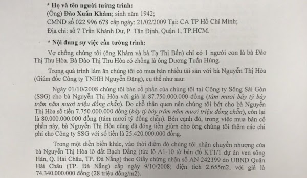 Nội dung đơn thư thể hiện, năm 2008, ông Khảm có mua của bà Nguyễn Thị Hòa lô đất A1-10 dự án ven sông Hàn, quận Hải Châu, TP. Đà Nẵng theo giấy chứng nhận quyền sử dụng đất số AN-242399 với giá hơn 74 tỷ đồng.