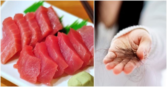 Theo nhiều nghiên cứu chỉ ra rằng, có một số loại cá biển lớn như cá buồm, cá ngừ đại dương,… có chứa một hàm lượng lớn thủy ngân trong cơ thể. Vì vậy, Dịch vụ Y tế Quốc gia (NHS) tại Anh khuyến cáo rằng nếu cơ thể chúng ta ăn quá nhiều cá chứa vi lượng thủy ngân vào cơ thể thì không chỉ gây ảnh hưởng đến sức khỏe mà còn cản trở khả năng hấp thụ kẽm. Từ đó dẫn đến tình trạng tóc mỏng dần đi và rụng nhiều hơn.