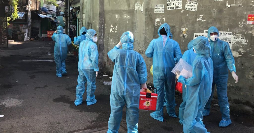 Ảnh: Lấy mẫu xét nghiệm người dân quanh khu vực có ca nhiễm liên quan đến hội thánh ‘truyền giáo phục hưng’ ở quận Gò Vấp.