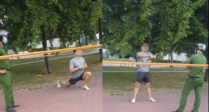 Sáng 10.7, trên mạng xã hội lan truyền clip ghi lại cảnh một nam thanh niên không đeo khẩu trang, thản nhiên tập thể dục tại công viên. Sự việc có sự chứng kiến của 2 cán bộ công an, một lúc sau người này được đưa về phường.