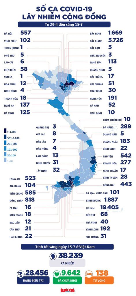 Tính đến 6h ngày 15-7, Việt Nam có tổng cộng 36.280 ca ghi nhận trong nước và 1.959 ca nhập cảnh. Số lượng ca mắc mới ghi nhận trong nước tính từ ngày 27-4 đến nay là 34.710 ca, trong đó có 6.850 bệnh nhân đã được công bố khỏi bệnh. Tổng số ca được điều trị khỏi từ đầu mùa dịch là 9.624 ca.