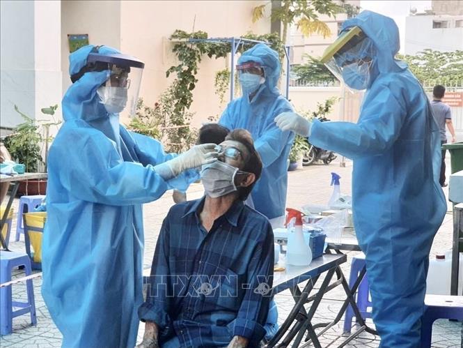 Lấy mẫu xét nghiệm cho người dân tại một điểm lấy mẫu trên địa bàn phường 3, Quận 4. Ảnh: Hồng Giang/TTXVN