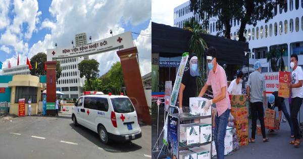 Tiếp tế nhu yếu phẩm tại Bệnh viện Bệnh nhiệt đới TP HCM – Ảnh: NLĐ