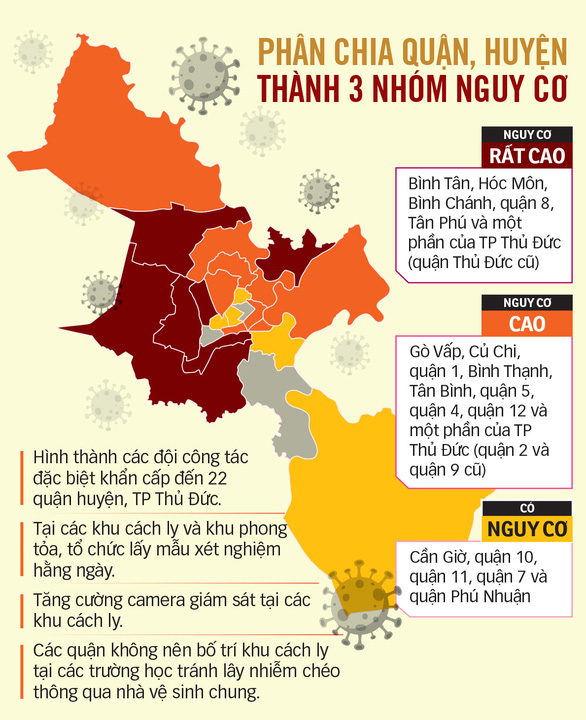 Đồng thời, tăng cường tổ công tác đặc biệt tại những nơi có nguy cơ cao như sân bay Tân Sơn Nhất, cảng hàng hải, bến xe, nhà ga… và hỗ trợ một số quận huyện đang có tình hình dịch bệnh phức tạp. Riêng tại các KCN, KCX, Khu công nghệ cao, Công viên phần mềm Quang Trung, TP giao cho ban quản lý chịu trách nhiệm cao nhất.