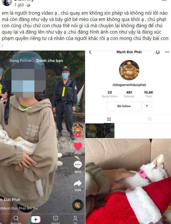 Clip dài gần 3 phút, đăng tải trên mạng xã hội TikTok bởi tài khoản Mạnh Đức Phát, ghi lại cuộc nói chuyện giữa một công an và hai thanh niên (một nam, một nữ). Trong clip, cô gái vừa khóc vừa xin được cho phép qua trạm kiểm soát để đưa con mèo đi khám thú y. Cô gái và chàng trai đi cùng trên xe máy chở con mèo bệnh không xuất trình giấy tờ tùy thân. Người đàn ông quay clip không đồng ý và giải thích rằng đang kiểm soát dịch Covid-19 theo Chỉ thị 16.