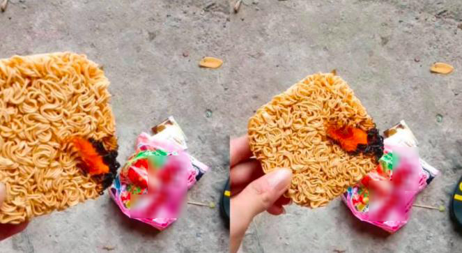Đ.ốt mì ăn liền để chứng minh có nhựa bên trong là trào lưu gây xôn xao cho dân mạng. (Ảnh: Chụp màn hình)