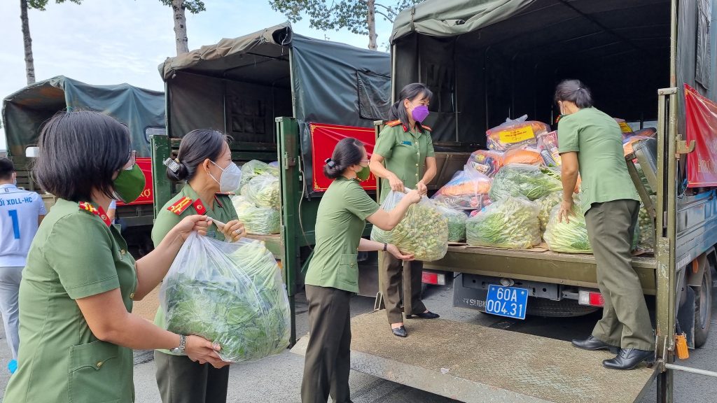 Nữ cán bộ Công an tỉnh Đồng Nai vận chuyển nhu yếu phẩm từ “Gian hàng 0 đồng” tặng người dân nghèo trong khu nhà trọ