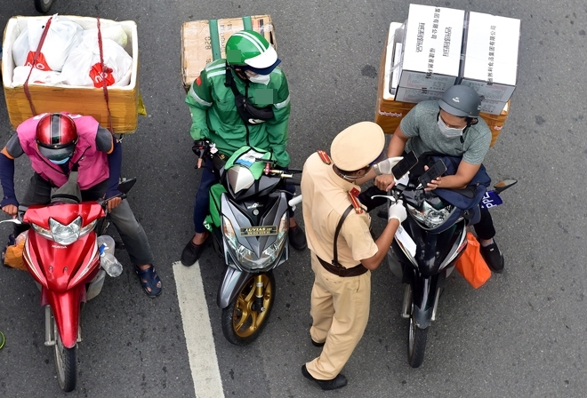 Lực lượng chức năng kiểm tra giấy đi đường của chủ phương tiện đang lưu thông. (Ảnh: Pháp Luật TP.HCM)