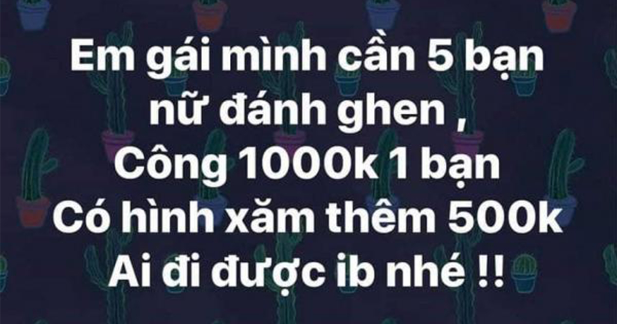 Bài đăng tìm 5 bạn nữ đánh ghen với tiền công lên đến tiền triệu và có thưởng thêm nếu có hình xăm của một cô gái trên mạng xã hội thu hút rất nhiều sự quan tâm.