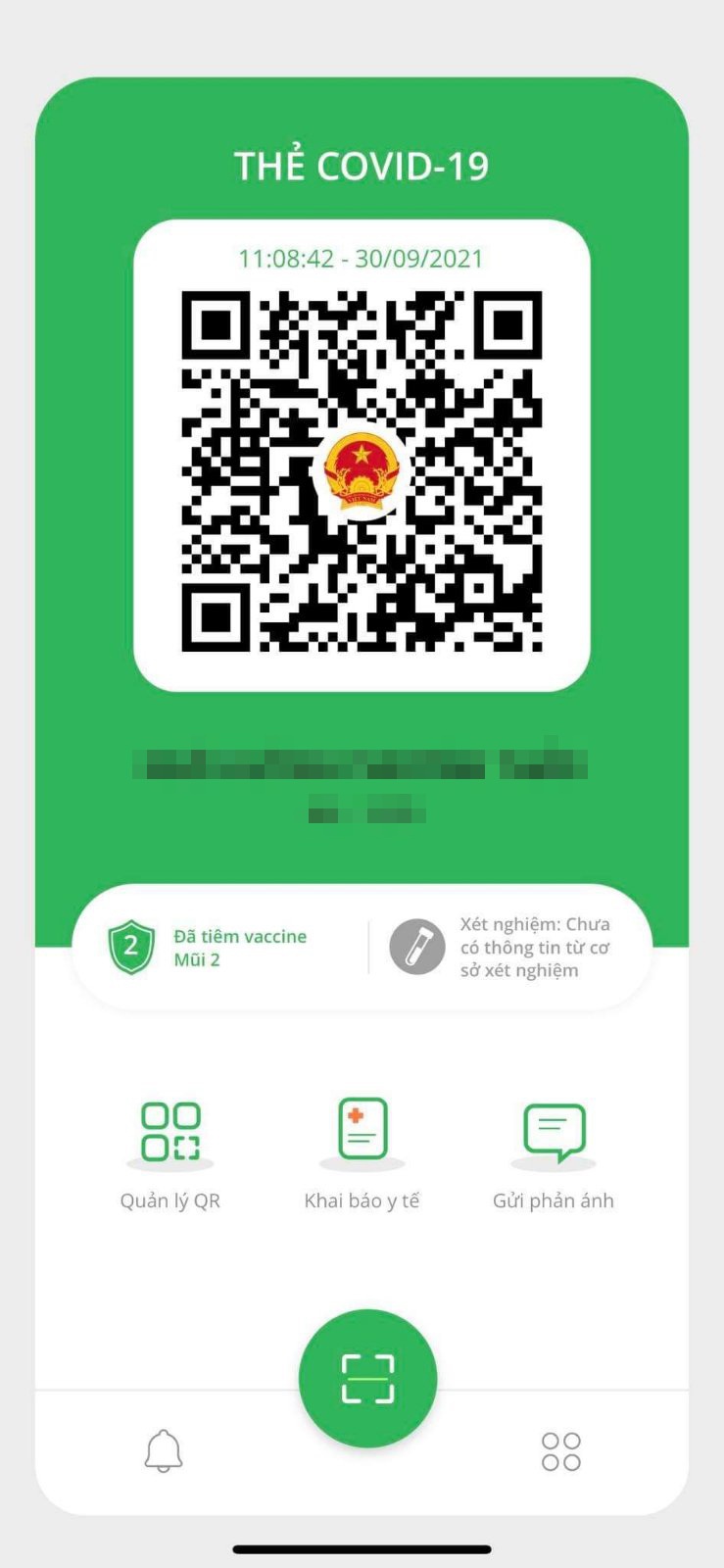 Màn hình hiển thị thẻ xanh Covid trên ứng dụng PC-COVID