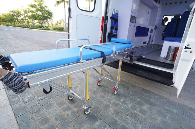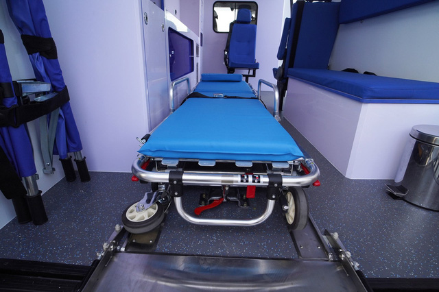 Kéo cáng ra кʜỏι xe, chân cáng τự cập xuống. (Nguồn ảnh: THACO AUTO)