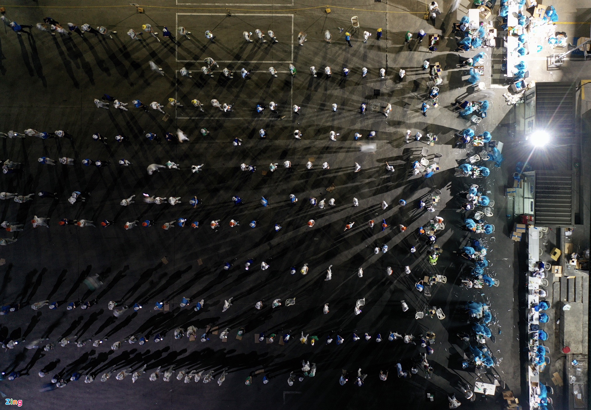 2.800 công nhân Công ty Nidec Sankyo ở Khu Công nghệ cao TP.HCM xếp hàng lấy mẫu xét nghiệm trong đêm 29/6 sau khi công ty ghi nhận ca dương tính. Ảnh: Quỳnh Danh.