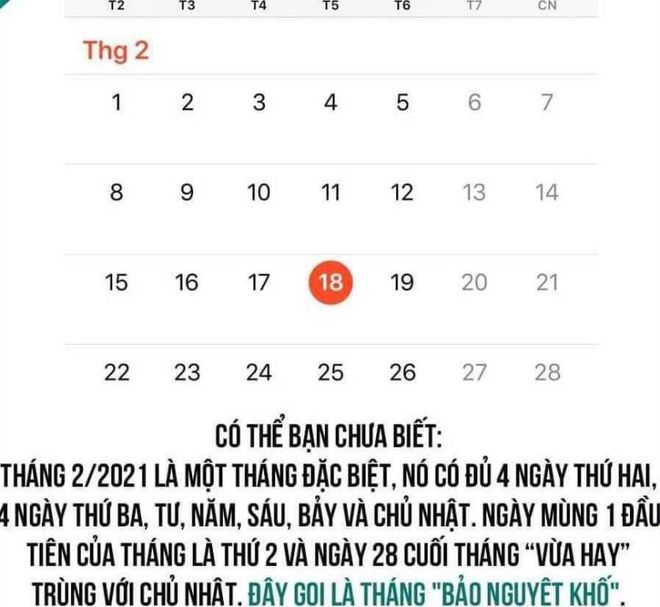 Những ngày gần đây người trẻ rầm rộ chia sẻ về thông tin tháng đặc biệt nhất khi hơn 800 năm mới có một lần. Tháng 2.2021 là tháng mà hiếm khi có đầy đủ 4 ngày thứ hai, 4 ngày thứ ba, thứ tư, thứ năm, thứ sáu, thứ bảy và chủ nhật. Ngoài ra, một điều đặc biệt khác là ngày mùng 1 đầu tiên của tháng rơi vào thứ 2 và ngày cuối cùng của tháng (ngày 28) rơi vào đúng chủ nhật.