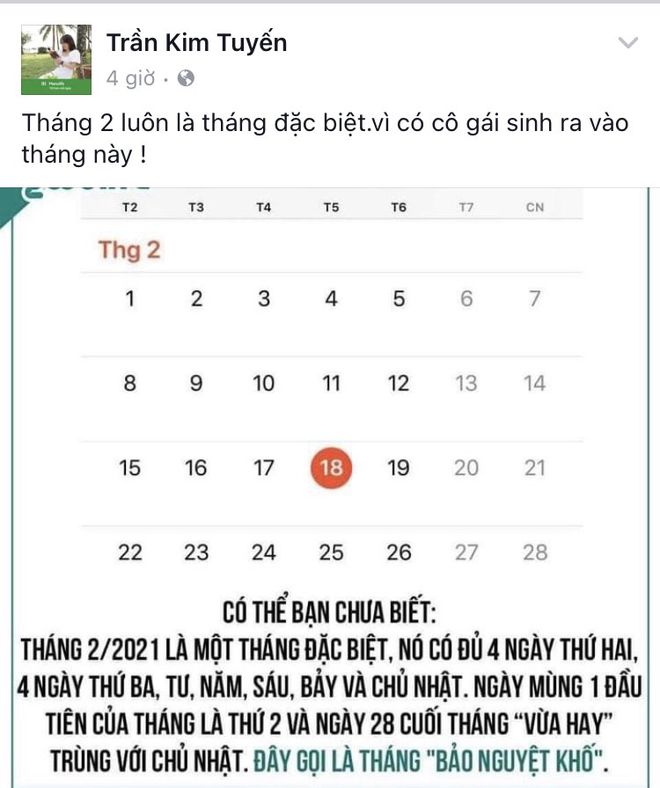 Những ngày gần đây người trẻ rầm rộ chia sẻ về thông tin tháng đặc biệt nhất khi hơn 800 năm mới có một lần. Tháng 2.2021 là tháng mà hiếm khi có đầy đủ 4 ngày thứ hai, 4 ngày thứ ba, thứ tư, thứ năm, thứ sáu, thứ bảy và chủ nhật. Ngoài ra, một điều đặc biệt khác là ngày mùng 1 đầu tiên của tháng rơi vào thứ 2 và ngày cuối cùng của tháng (ngày 28) rơi vào đúng chủ nhật.