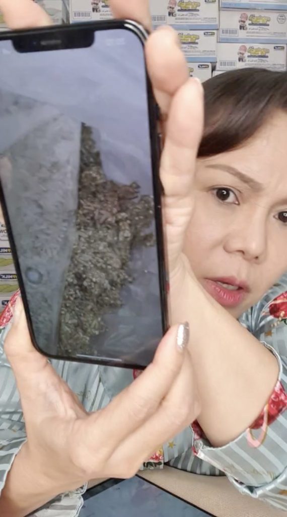 “Sáng nay, có người ném cục gạch vô nhà tôi, có duyên lắm. Tôi sẽ quay cho mọi người xem. Trước sân nhà tôi có một cái hàng rào. Buổi sáng tôi ngủ dậy thấy có người ném cục gạch qua hàng rào vào trước cửa nhà tôi để xin quà. Trong cục gạch đính kèm tờ giấy ghi số điện thoại, thông tin nhà ở hẻm nào, có con nhỏ ra sao. Mọi người thấy thương không? Khổ lắm”, nữ danh hài kể.