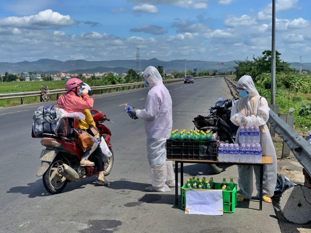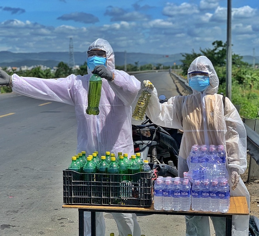 Từ ngày 30.7, đoạn giao QL1A – QL25 (Phú Yên) xuất hiện một cặp vợ chồng mặc đồ bảo hộ kín mít, đứng cạnh những chai xăng được xếp ngay ngắn trong một cái rổ đặt gọn bên đường. Thấy dòng người lỉnh kỉnh đồ đạc trên xe về quê, họ cầm chai xăng trên tay vẫy vẫy: “Xăng miễn phí đây anh chị ơi!”.