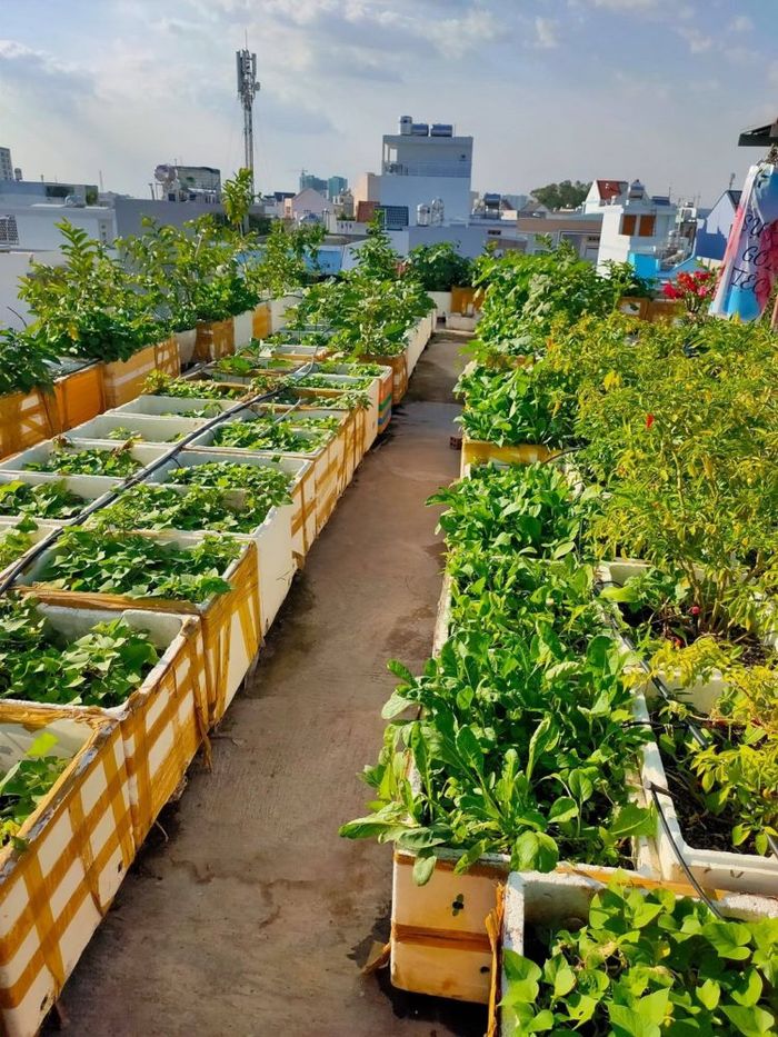 Giống như chị Trang, chị Hằng – một bà mẹ trẻ ở Hải Phòng cũng đã “hô biến” sân thượng nhà mình thành một khu vườn rau trái xanh mát khiến ai ai cũng thích thú. Ảnh: Eva