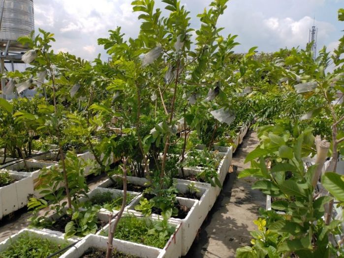 Khó khăn bước đầu là vậy nhưng vì đam mê, gia đình chị Trang cứ “mở rộng” dần các loại cây trồng. Chỉ trong hai năm, gia đình chị đã đưa về sân thượng nhà mình hơn 100 gốc ổi lê cùng các rau củ và cây ăn quả khác như đu đủ, mận, xoài, cóc… Song song đó, chị Trang còn tận dụng phần đất dưới hơn 100 gốc ổi để “tăng gia” thêm các loại rau xanh khác.