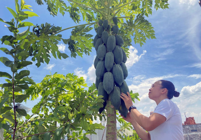 Những cây đu đủ trĩu quả ở “khu vườn trên cao” của gia đình chị Trang. Ảnh: VnExpress