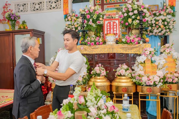 Quý Bình chỉnh trang cho ba trước khi lên đường sang nhà gái đón dâu. (Ảnh: FBNV)