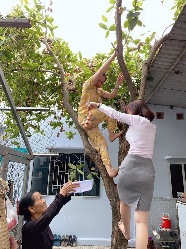 Bà xã Quý Bình mặc đồ công sở vẫn trèo cây hái mận cho mẹ chồng. (Ảnh: MXH)