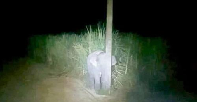 Ăn vụng thì cũng phải biết chùi mép, chú voi này ngay lập tức… nấp luôn ra sau cột điện và cứ đứng lì ở đó “đọ mắt” cùng bác chủ vườn mía. Mới đầu, bác này cũng hoảng sợ và thủ thế đề phòng trường hợp con vật tấn công.