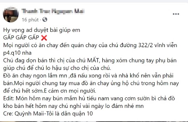 Bài viết kêu gọi mọi người đến ủng hộ xe đồ ăn của người đàn ông tại quận 10. Ảnh yeah1.com