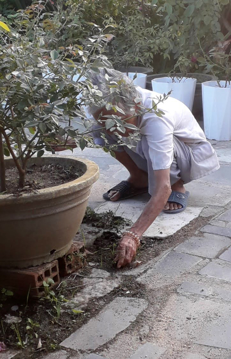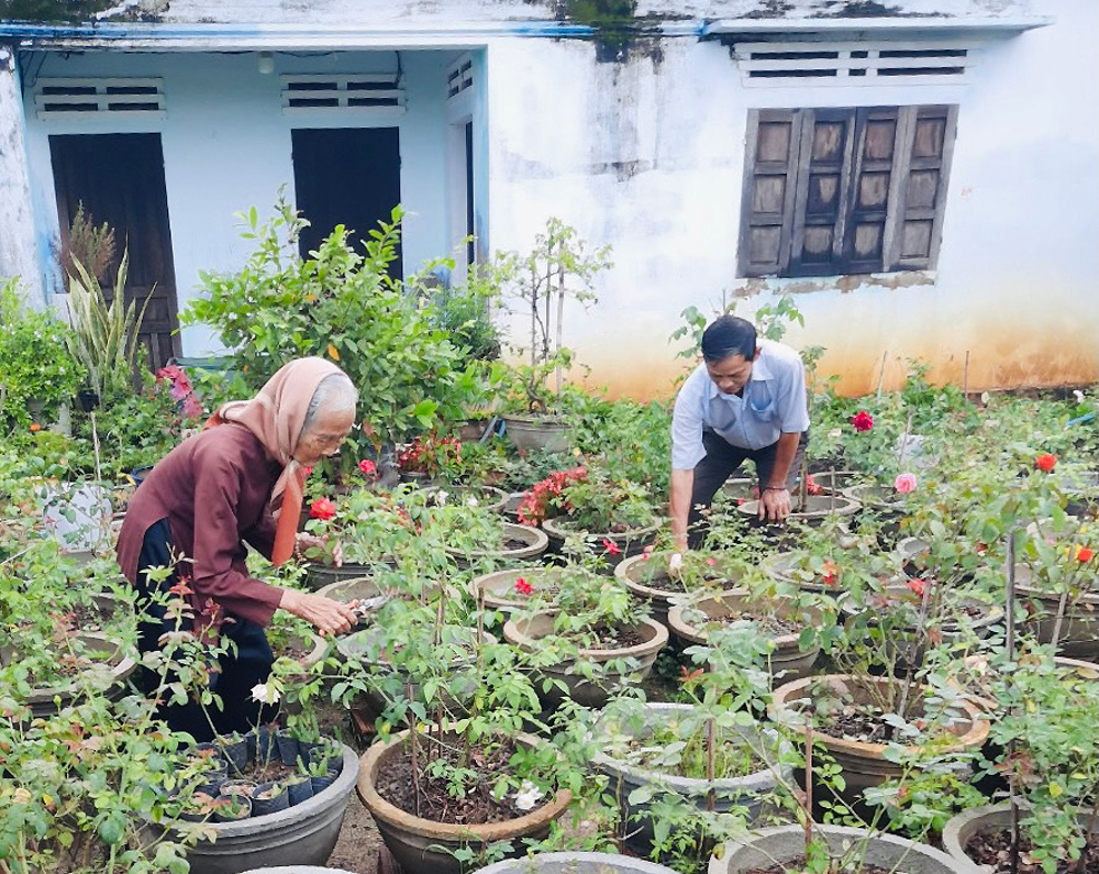 Vợ chồng chị Vui bận kinh doanh cửa hàng thiết bị điện nên một tay cụ Hơn chăm sóc vườn hồng. Hàng ngày sau khi thức dậy khăn nón đầy đủ, cụ đi dạo một vòng quanh vườn, nhổ cỏ rồi mới vào ăn sáng. Năm nay đã 107 tuổi, tay cụ nhổ vẫn thoăn thoắt giống như “ngày xưa nhổ mạ tính điểm”.