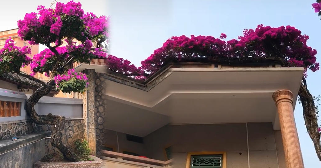 Theo những gì clip ghi lại, cây hoa giấy này có phần thân uốn lượn vô cùng đặc biệt, hoa nở thành từng chùm hồng rực cả khoảng sân. Không những vậy nó còn mọc leo lên phần mái nhà, ước chừng hàng chục mét. Người đăng clip viết: “Hoa giấy cổng đắt hơn vàng, nhiều tiền hơn vài căn hộ là đây”.