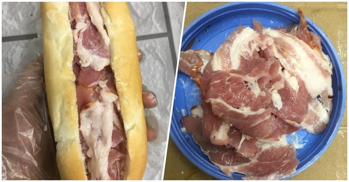 Phần thịt kẹp trong bánh mì được cho là chưa qua chế biến. (Ảnh: Hà Nội Ship Đồ Ăn Đêm 24h)