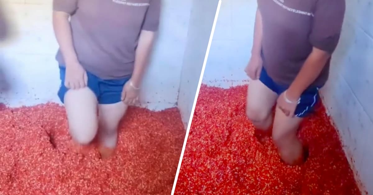 Người phụ nữ dùng chân trần để giẫm, trộn ớt trong bể. (Ảnh: Chụp màn hình)