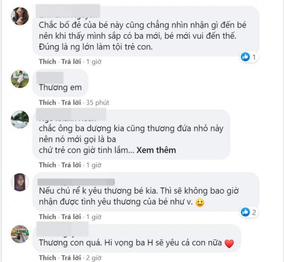 Dưới bình luận, nhiều người xúc động chia sẻ: “Thương em”, “Nếu chú rể không yêu thương bé kia. Thì sẽ không bao giờ nhận được tình yêu thương của bé như vậy”, “Chắc ba dượng kia cũng thương đứa nhỏ này nên nó mới gọi là ba, chứ trẻ con giờ tinh lắm, ai tệ với nó thì nó không gọi vậy đâu”, “Thương con quá. Hi vọng ba H sẽ yêu cả con nữa”, “Hy vọng bé sẽ có được 1 gia đình như bé ước mong”….