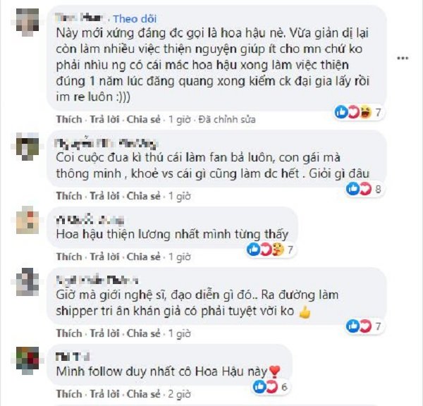 “Như này mới xứng đáng được gọi là Hoa hậu nè. Vừa giản dị lại còn làm nhiều việc thiện nguyện giúp ít cho mọi người chứ không phải nhiều người có cái mác hoa hậu xong làm việc thiện đúng 1 năm lúc đăng quang xong kiếm chồng đại gia lấy rồi im re luôn”.