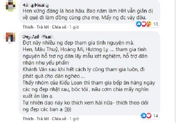 “Đợt này nhiều người đẹp tham gia tình nguyện mà. H’Hen Niê, Mâu Thuỷ, Hoàng Mi, Hương Ly… tham gia tình nguyện hỗ trợ người dân lấy mẫu xét nghiệm, hỗ trợ dân nhận nhu yếu phẩm. Khánh Vân sau khi hết cách ly cũng tham gia luôn, đi phát quà cho dân nghèo… Thấy nhóm của Kiểu Loan thì tham gia bếp ăn hàng ngày các người đẹp nhặt rau, bóc tỏi, nấu cơm chia mấy nghìn suất ăn lận ạ. Tự nhiên dạo này không thích xem hài nữa, thích theo dõi người đẹp các bạn ạ”.