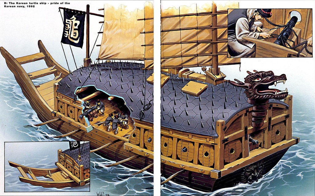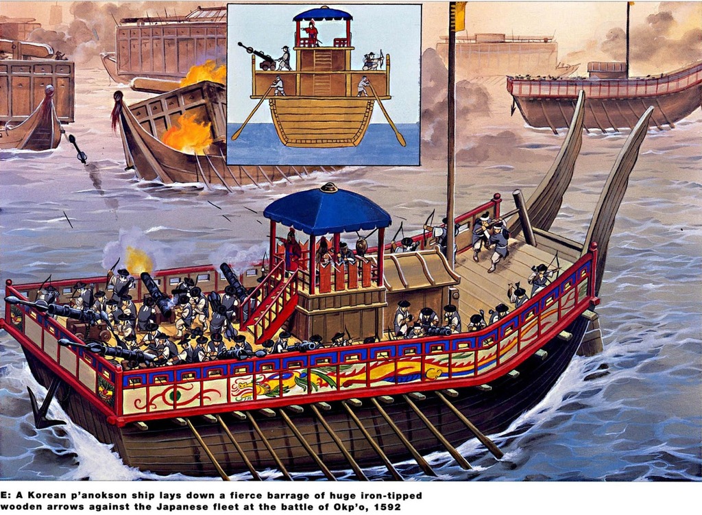 Chiến thuyền Panokseon (tàu mái bằng hay tàu thượng tầng) của Triều Tiên phóng những mũi tên gỗ bọc sắt khổng lồ vào hạm đội Nhật Bản.