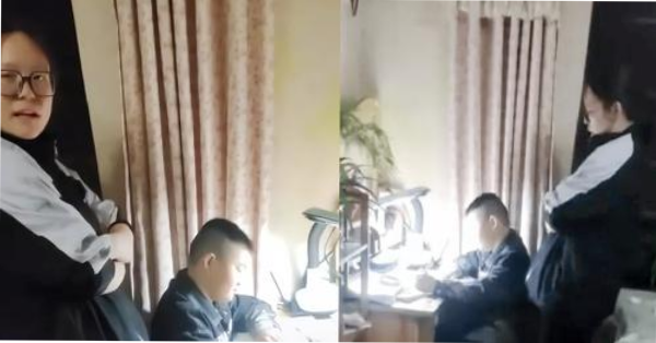 Theo những gì quay lại trong clip, con dâu lớn đang hướng dẫn con trai út làm bài tập về nhà. Em học sinh tiểu học ngồi ngay ngắn trước bàn học, thái độ vô cùng nghiêm túc, nhìn kỹ như là không dám thở mạnh. Với mẹ chồng, hình ảnh này vô cùng khoái chí, tự dưng con trai mình học ngoan hẳn.