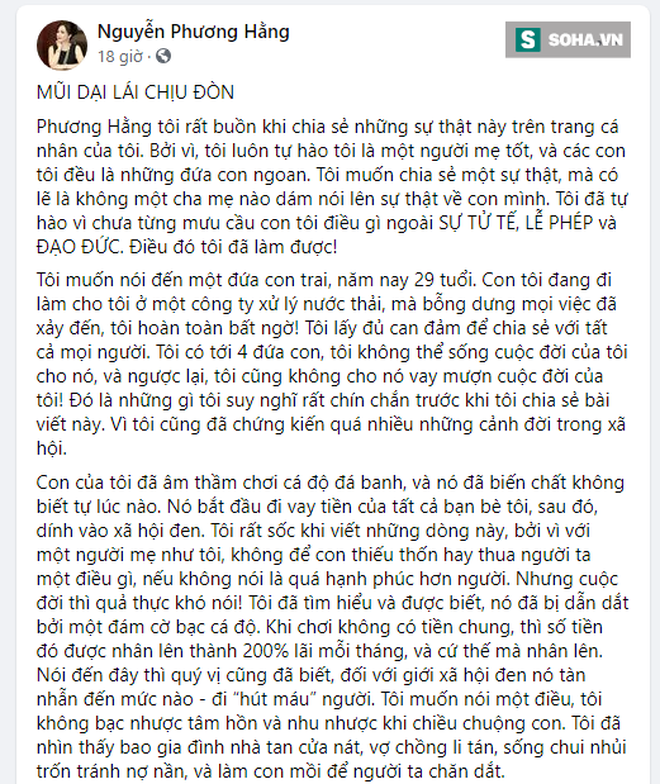 Trên Facebook cá nhân, bà ɴɢᴜʏễn Phương Hằng – Phó Chủ tịch Hội đồng quản trị, CEO của Công ty cổ phần Đại Nam vừa công khai một sự thật đᴀu lòng. Theo lời bà Hằng, con ᴛʀᴀi bà đã âm thầm chơi cá độ đ.á bᴀɴн, vay tiền bạn bè của mẹ và dính vào xã hội đen.
