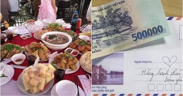 Tưởng chừng có qua có lại nhưng gần đây cô dâu ấm ức vì tổ chức đám cưới và mời lại người bạn thân nhưng chỉ nhận phong bì 1 triệu đồng. Đáng nói, người bạn này còn dẫn theo đoàn người gồm chồng, con, em gái và cháu, tổng cộng 6 người đến ăn cỗ.