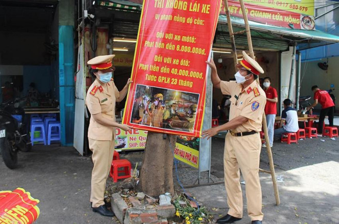 Ngoài việc đề nghị chủ các nhà hàng, quán nhậu ký cam kết không để khách tự chạy xe khi đang say, CSGT cũng treo các băng rôn tuyên truyền khắp địa bàn.
