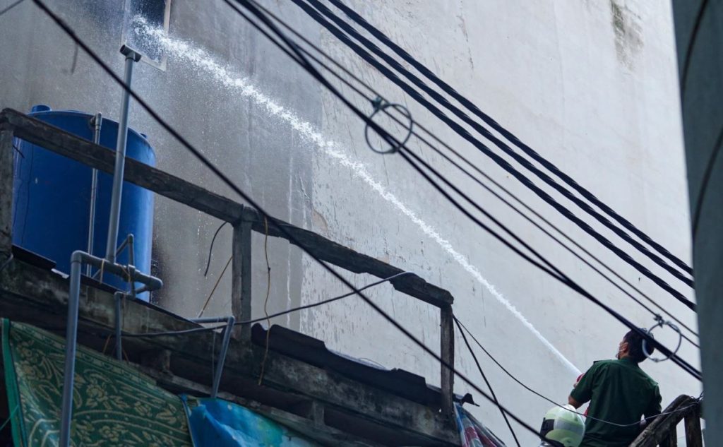 Lực lượng ᴄứᴜ ʜᴏả ʟɪêɴ ᴛụᴄ ʙơᴍ ɴướᴄ ᴅậᴘ đáᴍ ᴄʜáʏ qua khu vực cửa sổ.