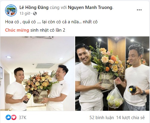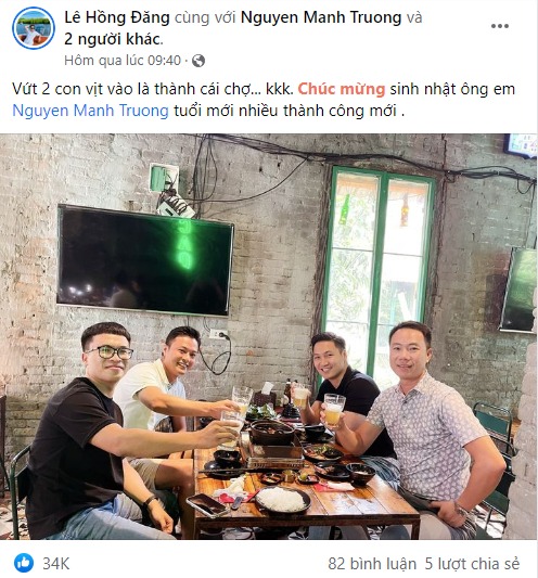 Nam diễn viên còn đính kèm theo dòng trạng thái chức mừng sinh nhật vô cùng vui vẻ nữa đó các mẹ: “Vứt 2 con vịt vào là thành cái chợ. Chúc mừng sinh nhật ông em Mạnh Trường, tuổi mới nhiều thành công mới”.