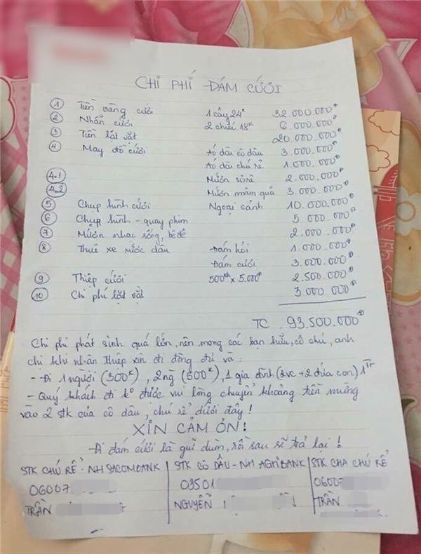 “Chi phí phát sinh đám cưới quá lớn nên mong các bạn hữu, cô chú, anh chị khi nhận thiếp xin đi đông đủ và: Đi 1 người (300k), đi 2 người (500k), 1 gia đình (2 vợ chồng + 2 con nhỏ = 1 triệu). Quý khách đi không được vui lòng chuyển khoản tiền mừng vào 2 số tài khoản của cô dâu, chú rể dưới đây! Xin cảm ơn! Đi đám cưới là giữ giùm, rồi sẽ trả lại!”.