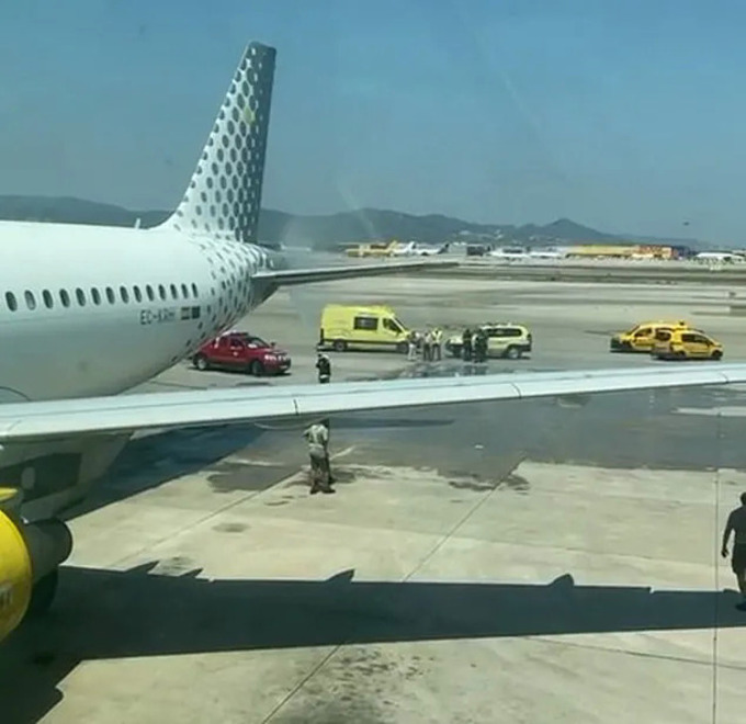 Nhân viên cứu hỏa và cảnh sát tại hiện trường máy bay của hãng Vueling gặp sự cố tại sân bay Barcelona hôm 21/7. Video: Sun.