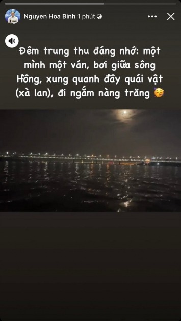 Cũng trong tối 10/9, Shark Bình lại gây chú ý khi chia sẻ dòng trạng thái đầy sầu não trên story Facebook cá nhân. Cụ thể, bạn trai Phương Oanh đăng tải đoạn clip ngắm trăng một mình kèm câu nói chất chứa đầy sự cô đơn: “Đêm trung thu đáng nhớ: một mình một ván, bơi giữa sông Hồng, xung quang toàn quái vật (xà lan), đi ngắm nàng trăng”.