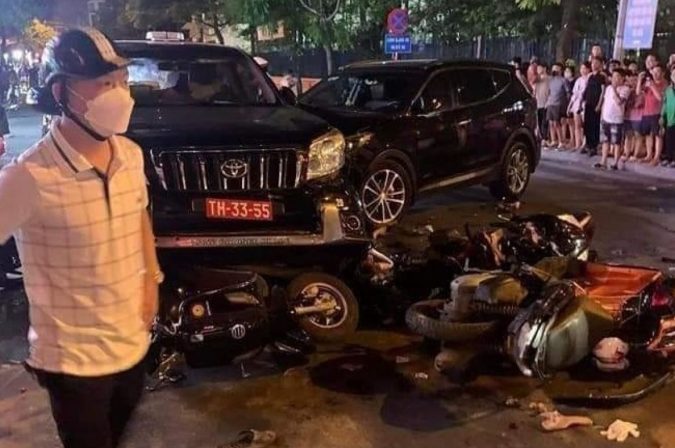 Trước đó khoảng 20h45 ngày 28/7, vụ đâm xe liên hoàn xảy ra tại nút giao Quang Trung – Ngô Thì Nhậm, quận Hà Đông, Hà Nội. Chiếc xe Santa Fe do Hà Thanh Hưng (sinh năm 1977, ở Yên Bái, tạm trú tại phường La Khê, quận Hà Đông) tông liên hoàn vào một xe biển đỏ, một taxi 5 chỗ, một ôtô bán tải. Các phương tiện này sau đó va vào 5 xe máy.